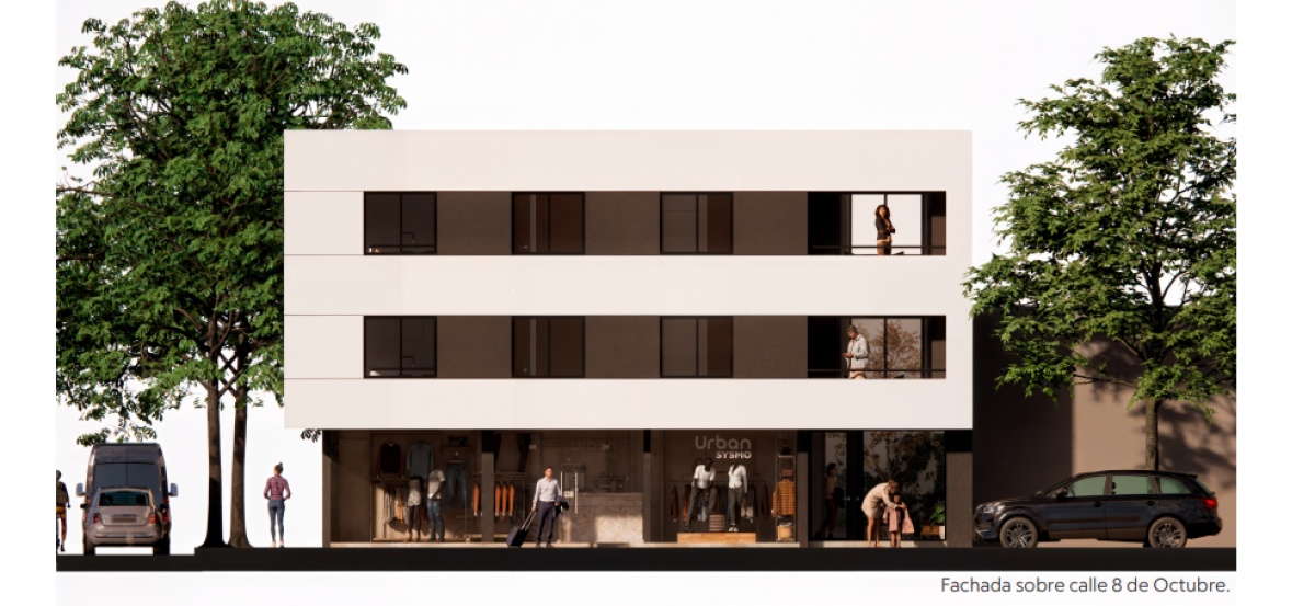 Se trata de un edicio de 7 apartamentos. Una unidad en planta baja, 3 en el primer nivel y 3 en el segundo nivel. Cuenta además con un local comercial sobre la calle 8 de Octubre.